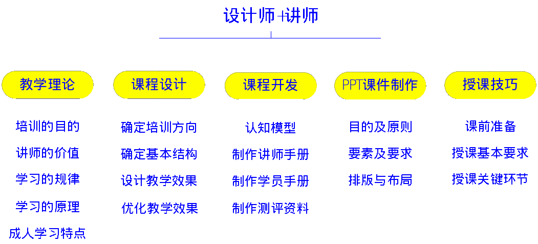 培養(yǎng)企業(yè)職業(yè)培訓師是企業(yè)培訓體系的核心之一,目前我們絕大部份企業(yè)里的內部講師都屬于兼職講師,他們除了擔任課程的講授者這一主要角色外,大多還兼任課程的設計者、課程的開發(fā)者、課外輔導者和企業(yè)文化的踐行者,這就要求內部講師具有比較全面的課程設計、課程開發(fā)、課程講授技能。