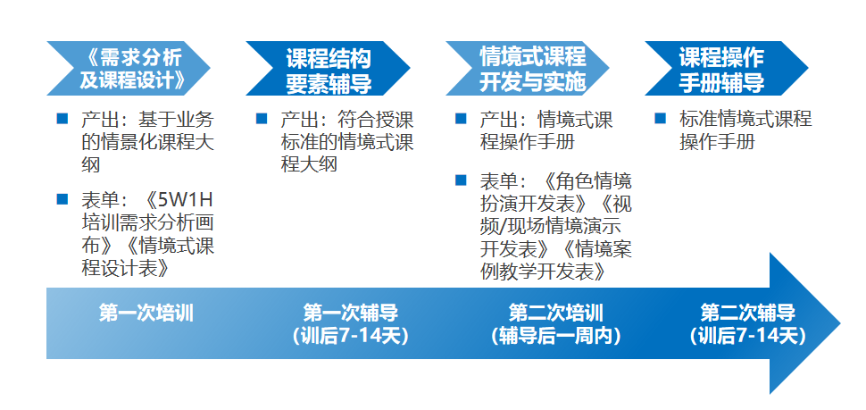 形成閉環:課程聚焦情境式課程的設計及開發,以情境式課程設計為內核,角色情境扮演、視頻/現場情境演示、案例情境教學為外衣,實現1+3高效情境式課程設計閉環,保證內容的完整性和落地性。