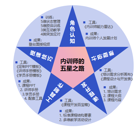 形成閉環(huán):課程基于內(nèi)訓師“五星模型”進行設(shè)計,內(nèi)容覆蓋企業(yè)內(nèi)訓全流程,學員以任務驅(qū)動的形式在課程中完成“課程設(shè)計-課程開發(fā)-工具制作-講臺呈現(xiàn)”的內(nèi)訓閉環(huán),保證內(nèi)容的完整性和落地性。