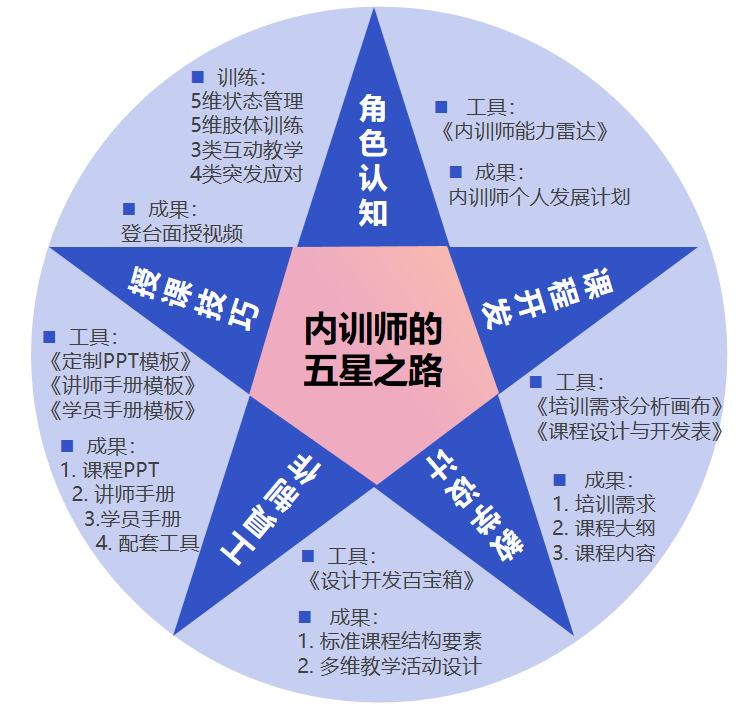 形成閉環:課程基于內訓師“五星模型”進行設計,內容覆蓋企業內訓全流程,學員以任務驅動的形式在課程中完成“需求調研-課程設計-課程開發-工具制作-講臺呈現”的內訓閉環,保證內容的完整性和落地性