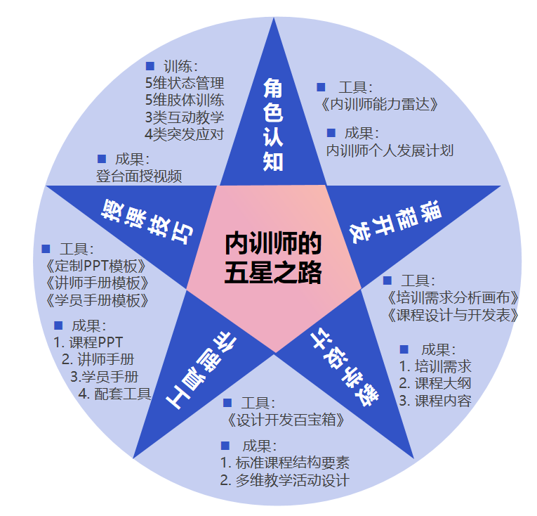 形成閉環(huán):課程基于內(nèi)訓(xùn)師“五星模型”進(jìn)行設(shè)計(jì),內(nèi)容覆蓋企業(yè)內(nèi)訓(xùn)全流程,學(xué)員以任務(wù)驅(qū)動(dòng)的形式在課程中完成“需求調(diào)研-課程設(shè)計(jì)-課程開發(fā)-工具制作-講臺(tái)呈現(xiàn)”的內(nèi)訓(xùn)閉環(huán),保證內(nèi)容的完整性和落地性。