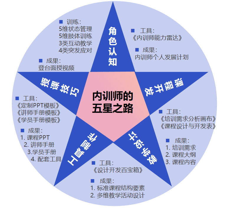 形成閉環(huán):課程基于內(nèi)訓師“五星模型”進行設(shè)計,內(nèi)容覆蓋企業(yè)內(nèi)訓全流程,學員以任務(wù)驅(qū)動的形式在課程中完成“需求調(diào)研-課程設(shè)計-課程開發(fā)-工具制作-講臺呈現(xiàn)”的內(nèi)訓閉環(huán),保證內(nèi)容的完整性和落地性。