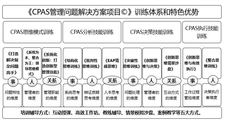 《CPAS復雜問題系統(tǒng)解決方案?》訓練輔導項目,分為“思維模式訓練”、“分析技能訓練”、“決策技能訓練”和“執(zhí)行技能訓練”等四大訓練模塊,訓練體系及特色優(yōu)勢如下表。