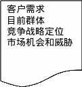 內部員工對本公司營銷策略如產品開發與組合、品牌、訂價、通路、傳播促銷、服務、組織管理等方面的看法、意見與建議,與同行相比的優劣勢、差異點。
