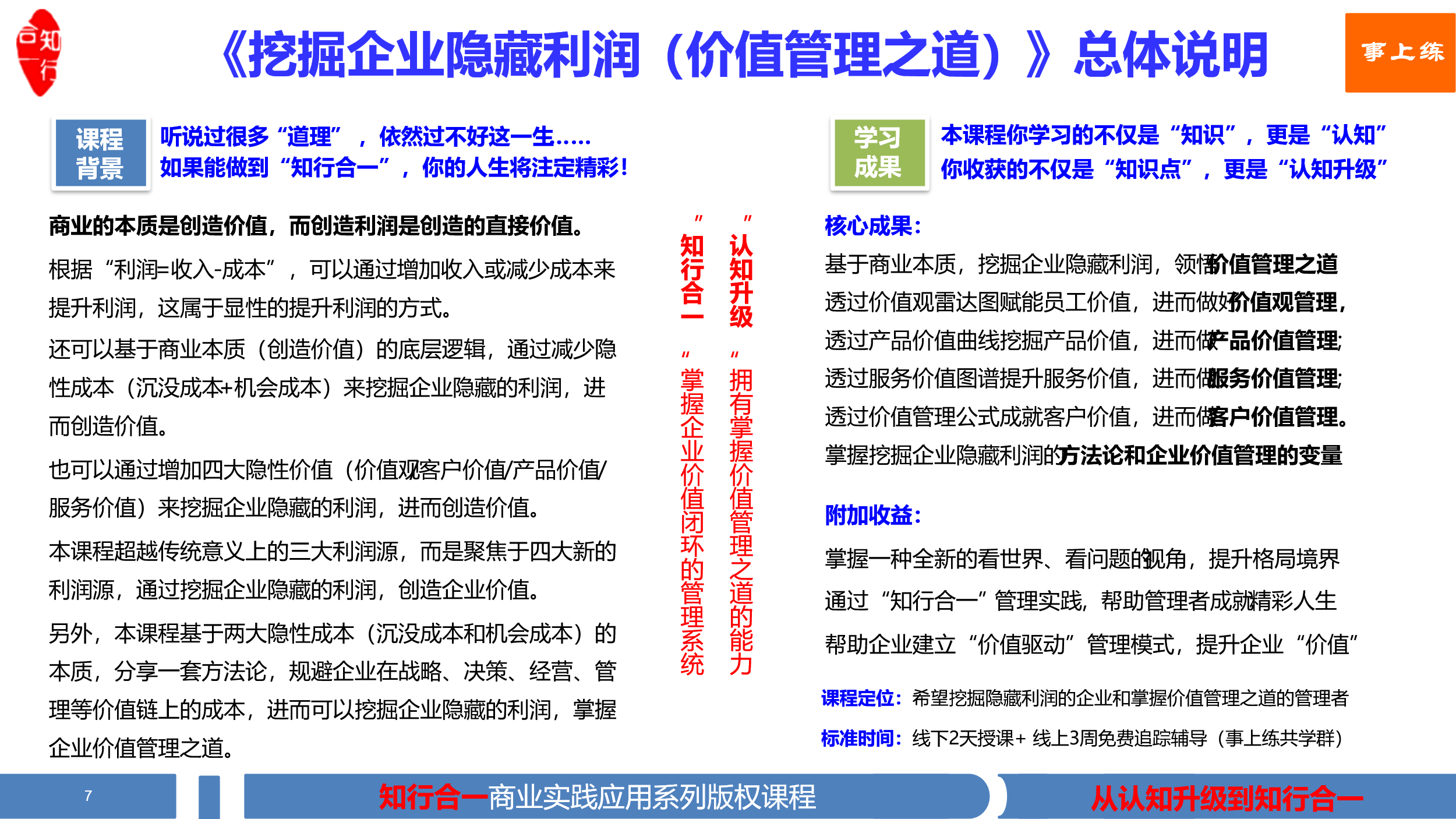 知行合一版權課--《挖掘企業隱藏利潤(價值管理之道)》課程大綱(2024版)