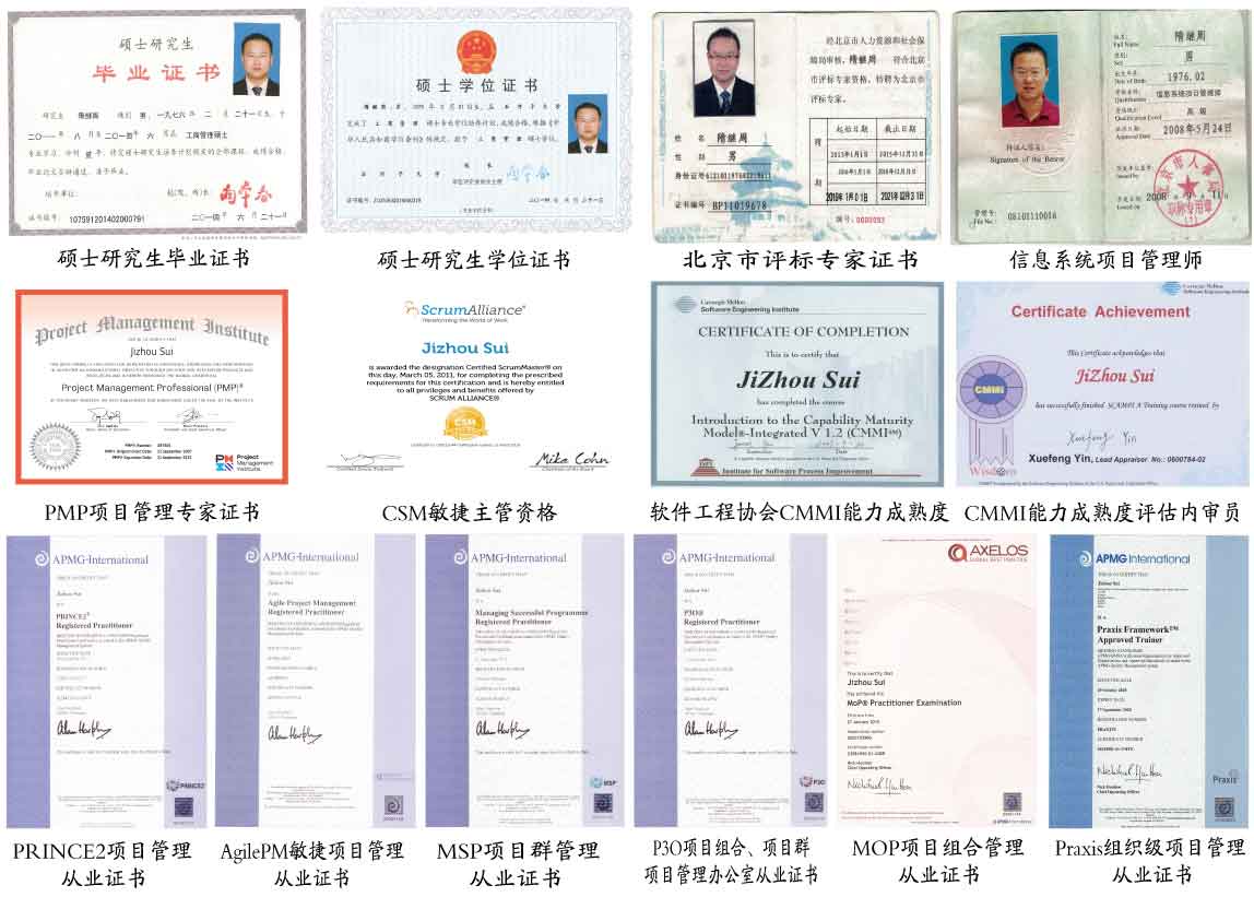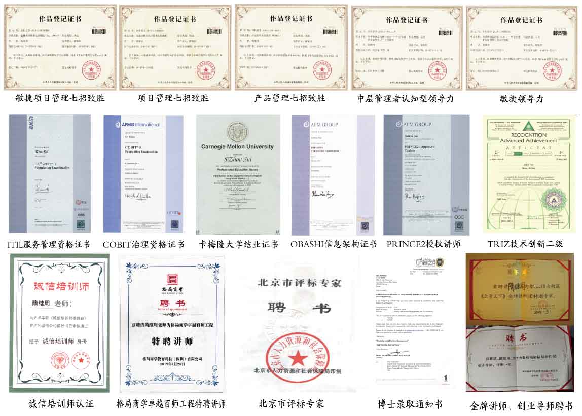 隋繼周老師擁有國(guó)際、國(guó)內(nèi)權(quán)威的項(xiàng)目管理、創(chuàng)新管理資格認(rèn)證及講師認(rèn)證,工業(yè)與信息化部信息系統(tǒng)項(xiàng)目管理師、系統(tǒng)集成高級(jí)項(xiàng)目經(jīng)理、人力資源與社會(huì)保障部投資決策項(xiàng)目管理管理師、PMP?(美國(guó)項(xiàng)目管理協(xié)會(huì)項(xiàng)目管理專(zhuān)業(yè)人士)、AgilePM?從業(yè)者(APMG敏捷項(xiàng)目管理專(zhuān)家)、PRINCE2?從業(yè)者(AXELOS項(xiàng)目管理專(zhuān)家)、MSP?從業(yè)者(AXELOS項(xiàng)目群管理專(zhuān)家)、MOP?從業(yè)者(AXELOS項(xiàng)目組合管理專(zhuān)家)、P3O?從業(yè)者(AXELOS項(xiàng)目辦公室管理專(zhuān)家)、PRAXIS?從業(yè)者(項(xiàng)目組合、項(xiàng)目群和項(xiàng)目管理專(zhuān)家)、SCRUM?主管(敏捷聯(lián)盟敏捷教練)、CMMI?內(nèi)審員(軟件工程協(xié)會(huì)軟件能力成熟度模型內(nèi)審師)、COBIT?5.0(ISACA協(xié)會(huì)受控的目標(biāo)與IT治理專(zhuān)家)、TTT國(guó)際沙盤(pán)認(rèn)證講師。