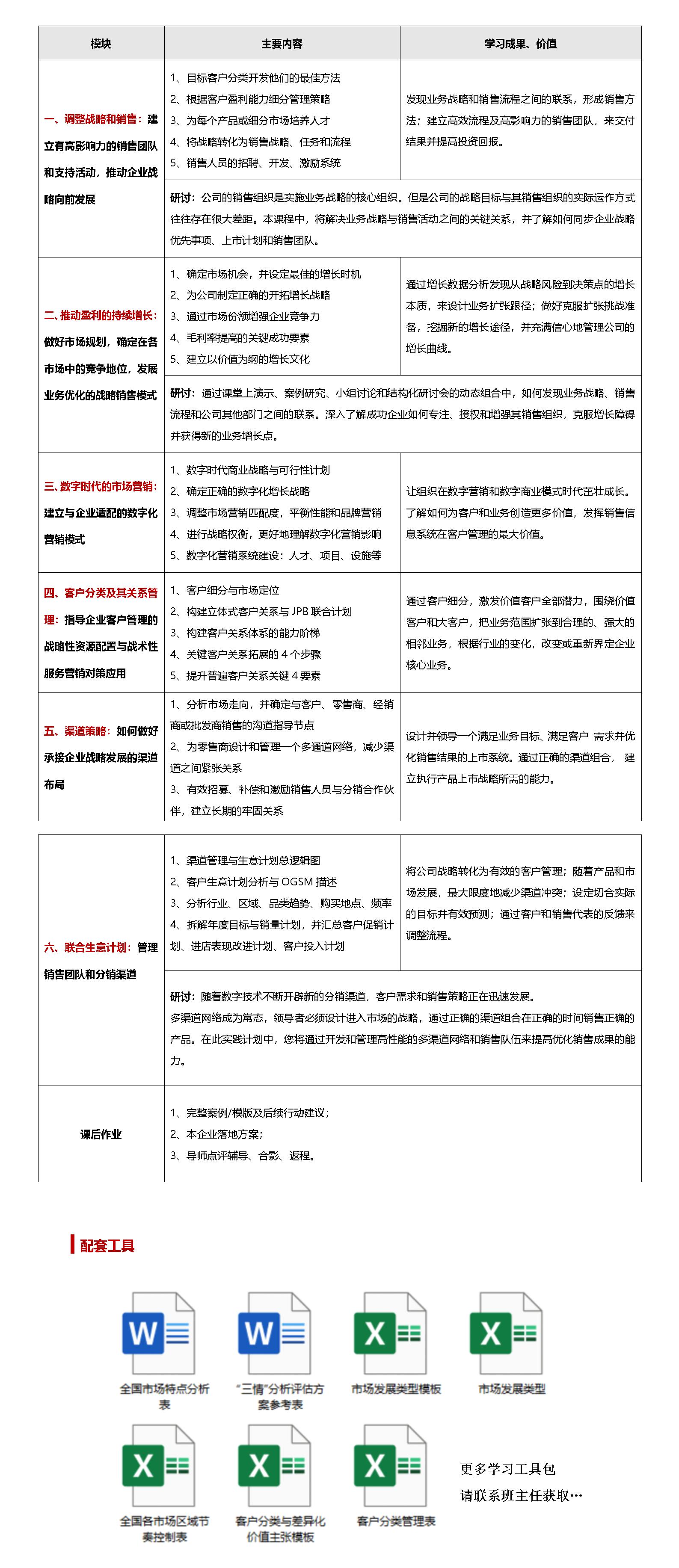 1、能力遷躍:通過系統學習,學會數字化時代如何將企業戰略、銷售戰略、產品策略形成合力,并讓數字化為核心業務助力。學會做“敵情、客情、我情”分析,學會分析全球/全國市場特點,學會制定市場整體營銷節奏,學會客戶分類分級管理;為企業戰略的制定,銷售戰略及產品策略的制定提供實操工具。