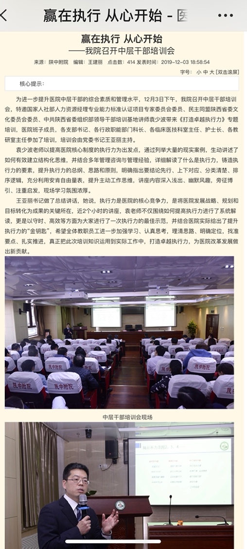 并為空軍軍醫大學第二附屬醫院、西安交通大學一附院、二附院、陜西省人民醫院、陜西婦女兒童醫院、寧夏自治區人民醫院、新疆自治區人民醫院、新疆醫科大二附院、青海紅十字醫院、陜西中醫院大學二附院等多家三甲醫院提供管理培訓服務,深得院方認可。課程效果在多家醫院官網及微信公眾號可見報道。