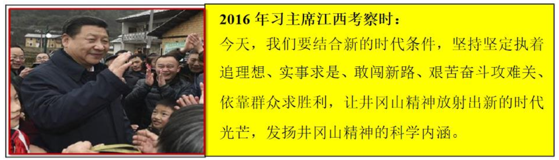 無私奉獻(xiàn)” 的“艱苦奮斗、勇于勝利”精神。 今天,我們要結(jié)合新的時代,堅持堅定執(zhí)著追求理想、實事求是、敢闖新路、艱苦奮斗攻難關(guān)、依靠群眾求勝利,讓井岡山精神放射出新的時代光芒,牢記使命,不忘初心,共建
